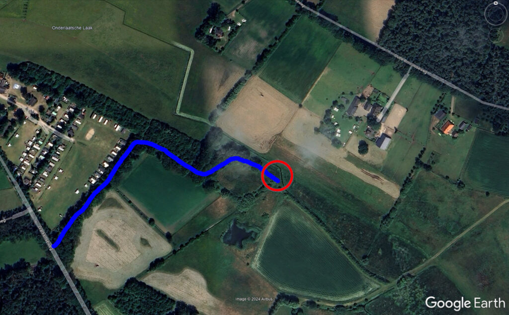 Afb.2 De route (blauw) om te lopen vanaf Warkenseweg, naast de voormalige camping, om bij de telpost te komen.